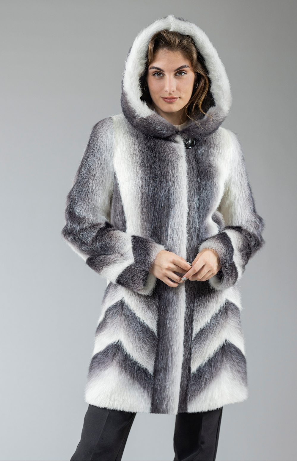 Шуба из меха нутрии представлена в цвете «деграде» (плавный переход из одного цвета в другой). Сегодня можно найти модели из меха нутрии интересных расцветок, которые смотрятся роскошно и нетривиально. Диагональное расположение шкур на изделии имитирует «фигурный» рисунок. Силуэт - легкая трапеция позволяет скрыть недостатки и подчеркнуть достоинства женской фигуры. Капюшон дарит не только комфортное тепло и защиту от агрессивного воздействия зимней погоды, но и таинственный женственный шик.Характеристики